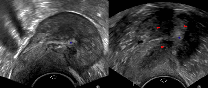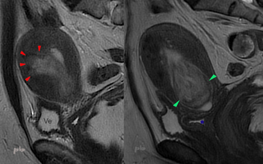 A gauche, l’endomètre (★) et la cavité sont irréguliers et le myomètre hétérogène.