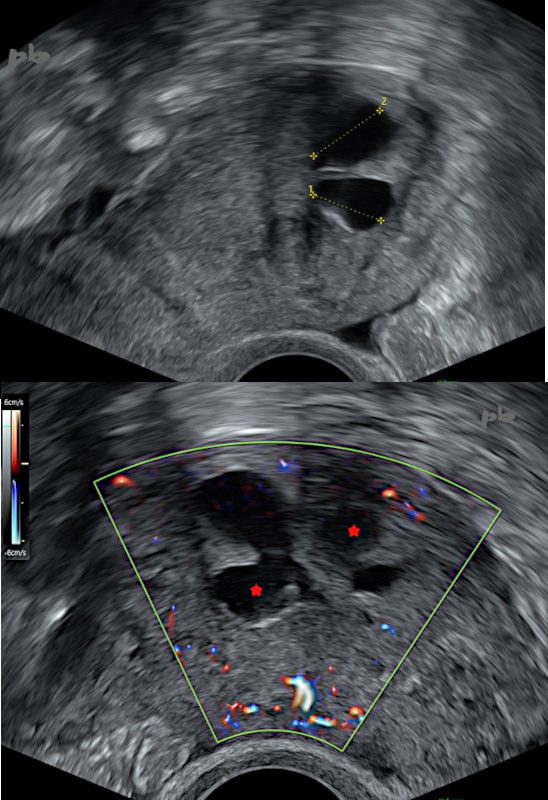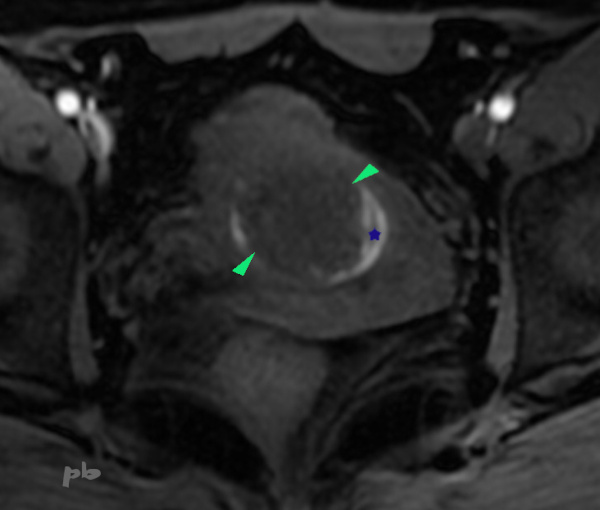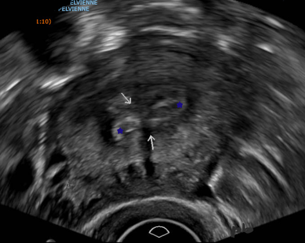 Endomètre bien visualisé (★), avec une striction (flèches) au milieu par disparition du revêtement muqueux de la cavité.