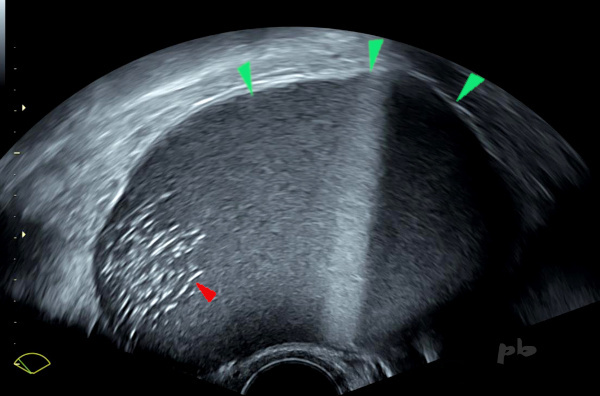 En déclive, visualisation d’échos intenses (►) très évocateurs de l’origine dermoïde.