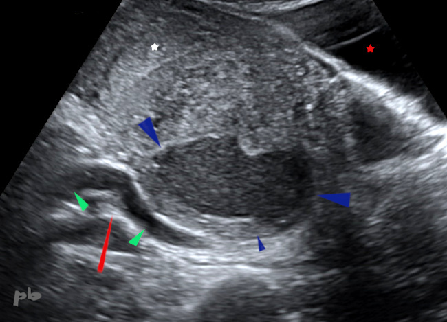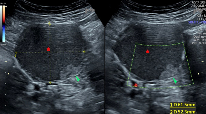 Contralateral ovary (★) with multiple follicles.