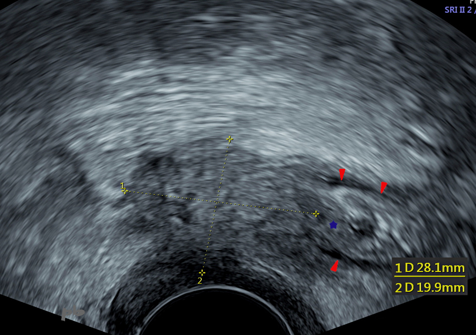 Nodule endométriosique hypoéchogène irrégulier marqué par les croix.
