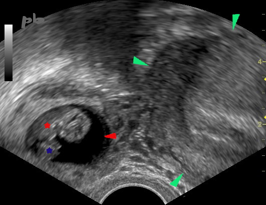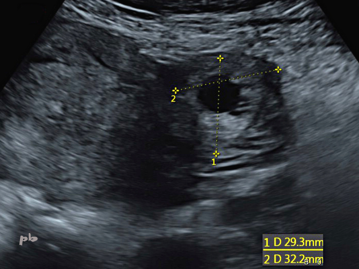 Appearance of a ‘target sign’ image to the left of the uterus (celomic cavity in the center and hyperechogenic trophoblast).