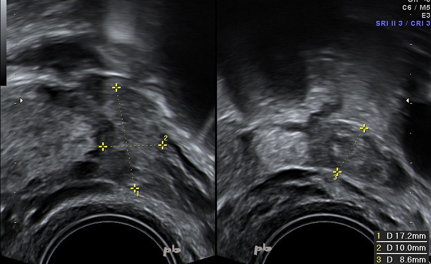 There were two corpus luteums. The left corpus luteum (★) is slightly hypoechoic compared to the rest of the ovarian tissue.