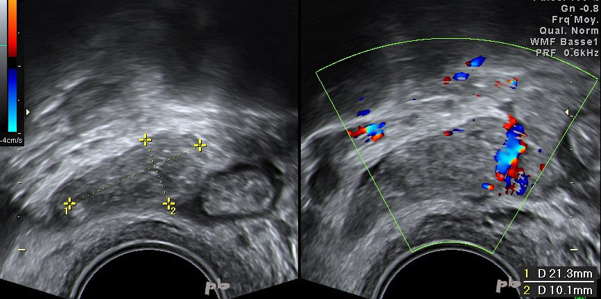 Couronne vasculaire autour des 2 images. Le doppler ne permet pas le diagnostic différentiel.