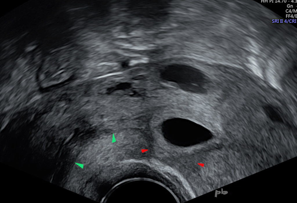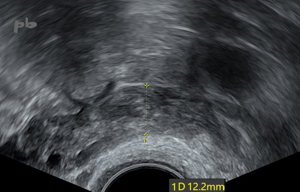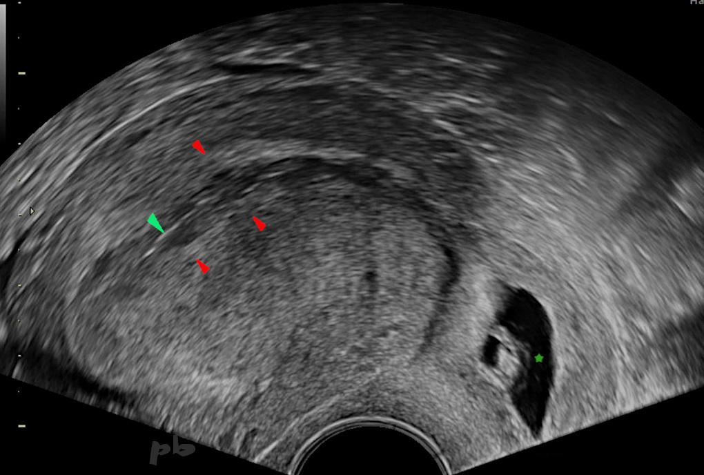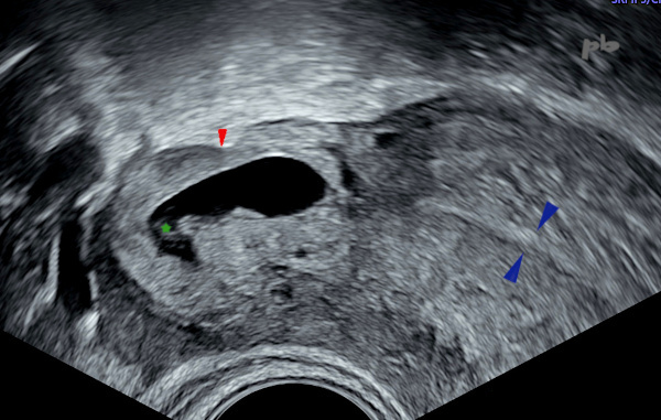 Hyperechogenic endometrium (►) and vacuity line (►). No hematometra.