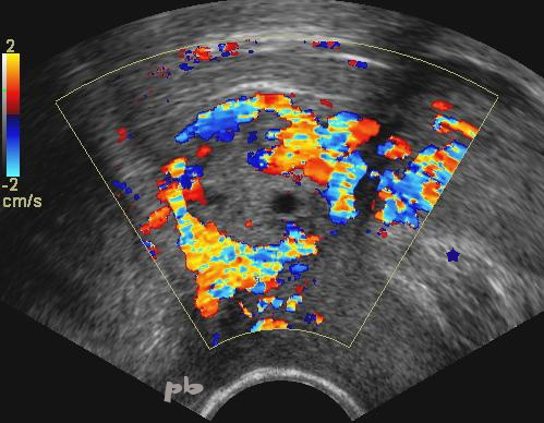 - Volumineuse image « en cible » au niveau de la corne utérine gauche.