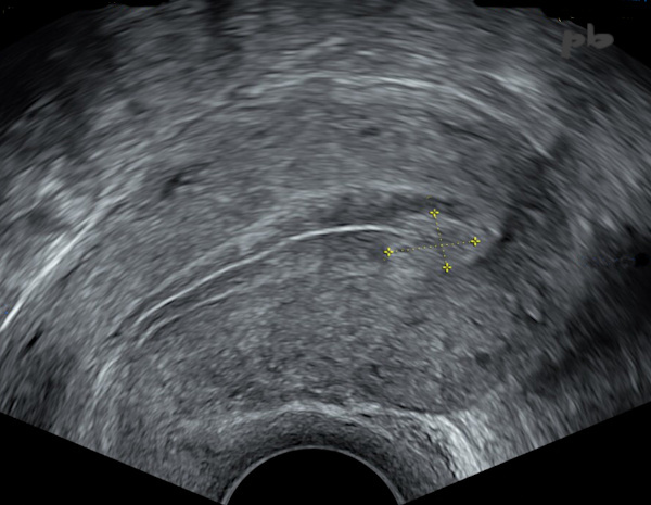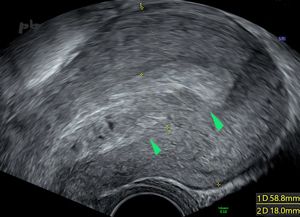 Entre les 2 marqueurs (►), l’interface endomètre – myomètre disparait.
