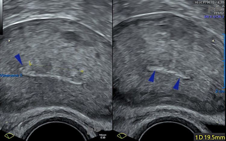 Muqueuse et cavité utérine (►) très épaissies et hétérogènes, avec effacement de l’interface en postérieur (marqueur supérieur ► sur l’image gauche).