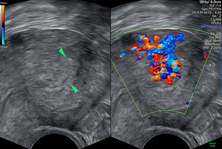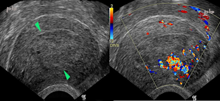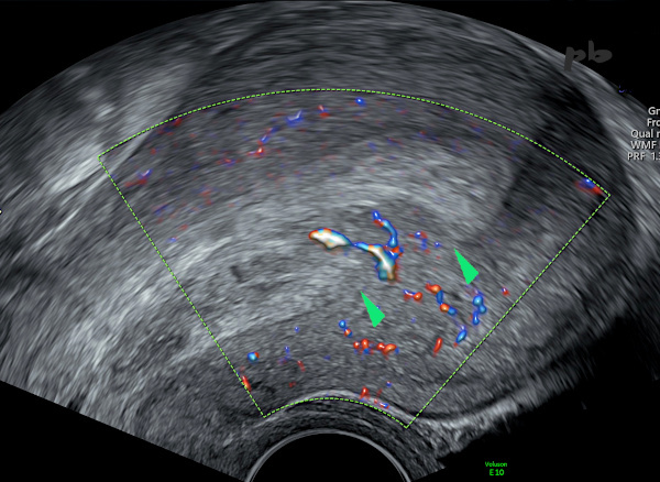 Entre les 2 marqueurs (►), l’interface endomètre – myomètre disparait : la portion isoéchogène au myomètre est vascularisée, correspondant à des résidus trophoblastiques et non hématiques.