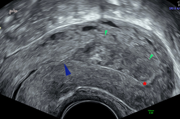 Masse hétérogène dans la cavité avec effacement de l’interface endomètre – myomètre en postérieur (►). Persistance d’une bande hyperéchogène en antérieur (endomètre ou caduques ★).