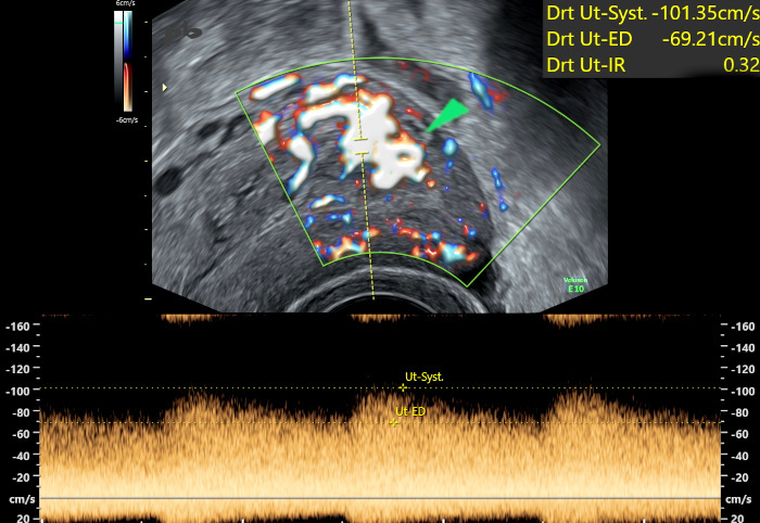 A ce niveau (sur l’image droite), riche vascularisation en doppler, à la fois dans le myomètre et dans la cavité : résidus trophoblastiques avec vascularisation de type utéro-placentaire. On utilise actuellement le terme purement descriptif d’anomalie vasculaire. Il ne s’agit pas d’une malformation artério-veineuse.